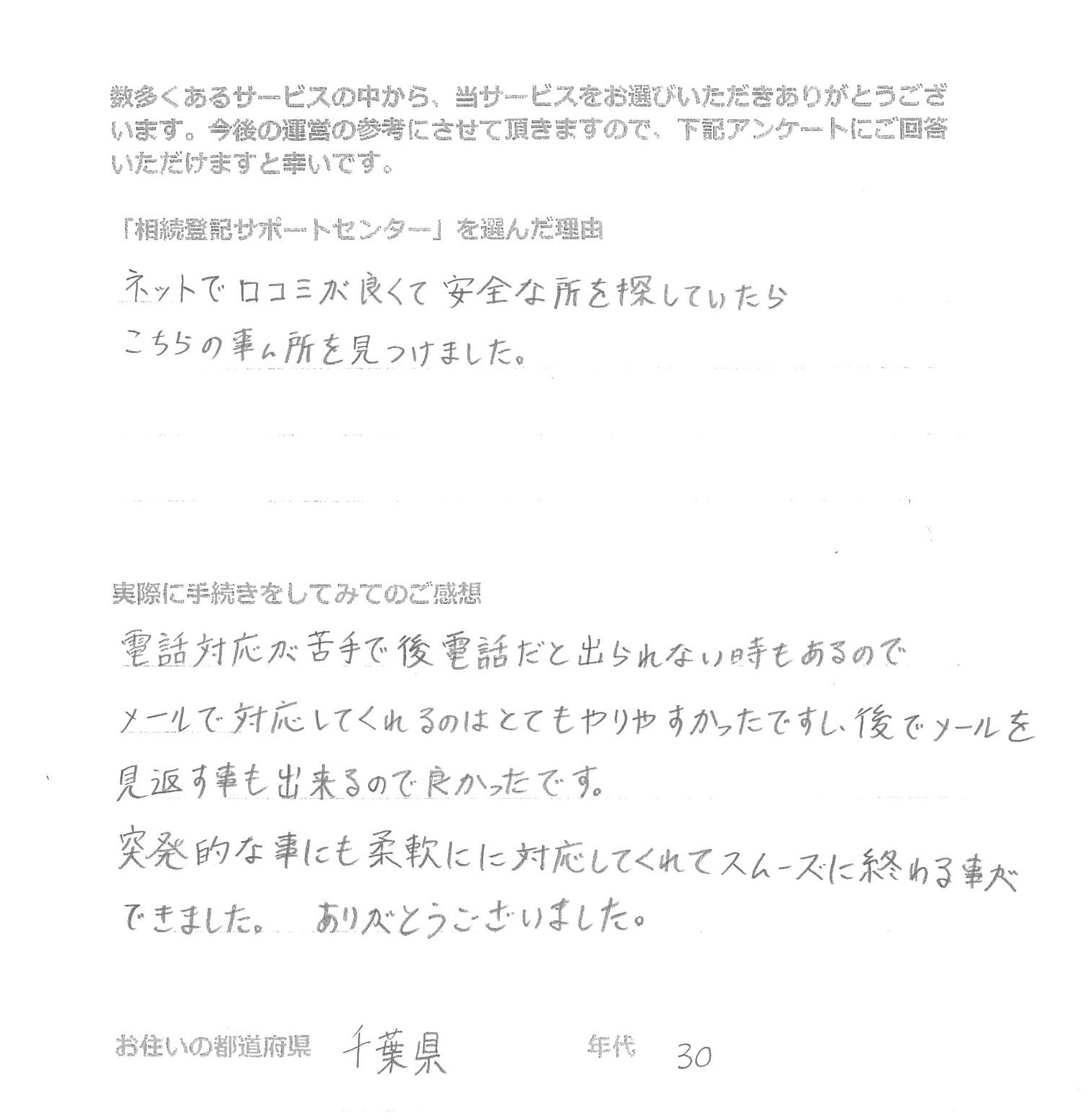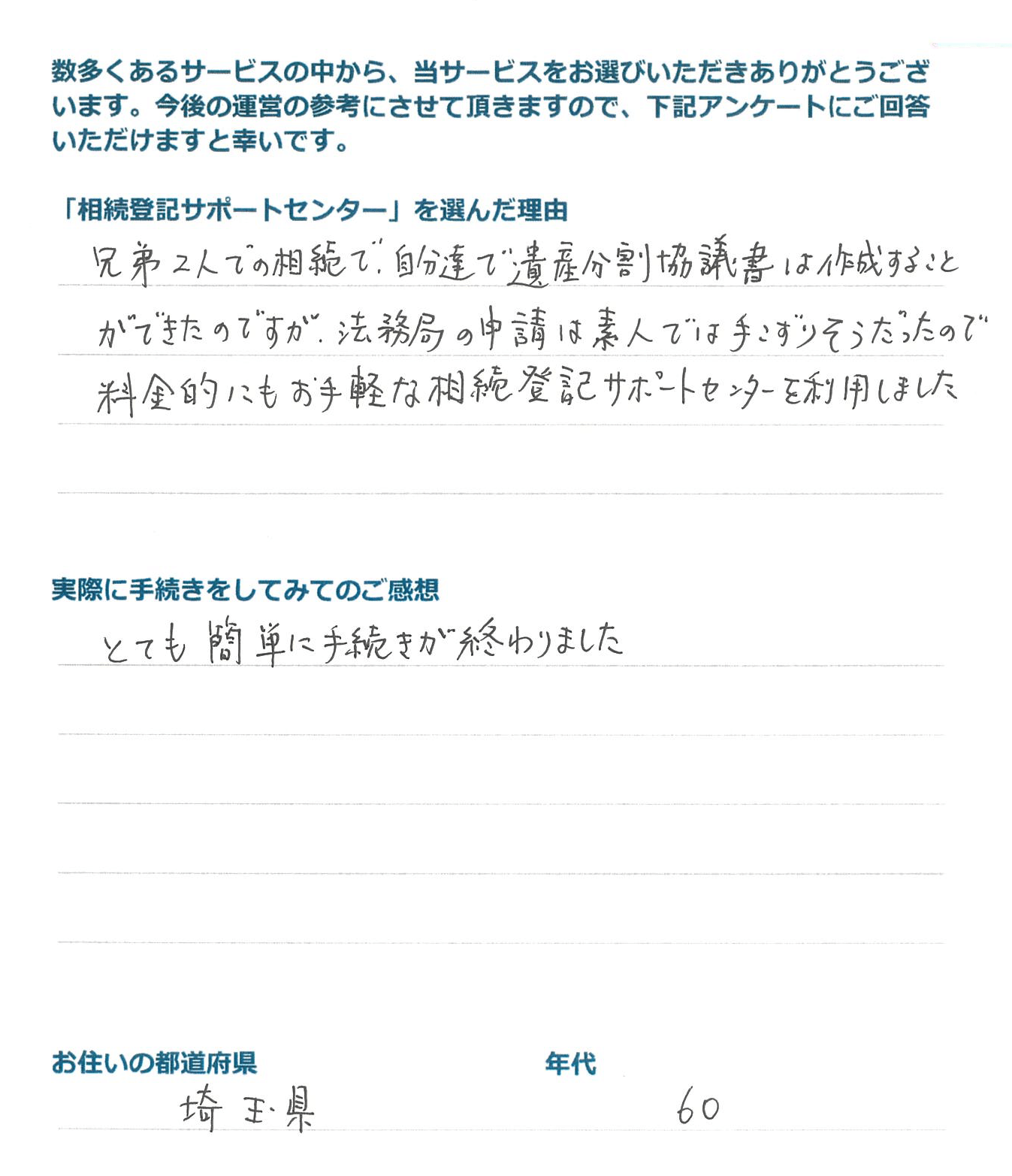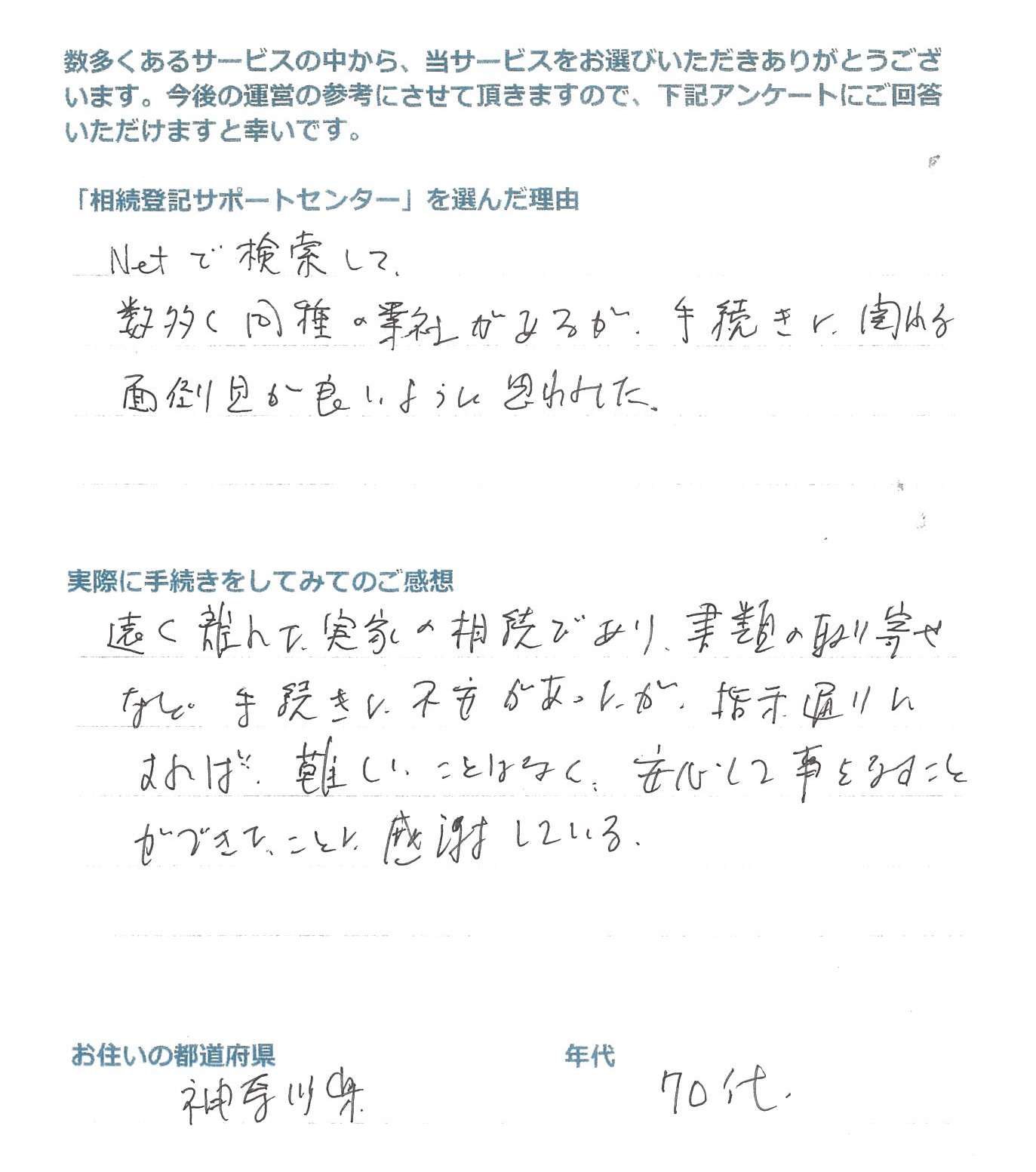 「相続登記サポートセンター」を選んだ理由 ネットで検索して、数多く同種の業者があるが、手続きに関わる面倒見が良いように思われた。 実際に手続きをしてみてのご感想 遠く離れた実家の相続であり、書類の取り寄せなど手続きに不安 …