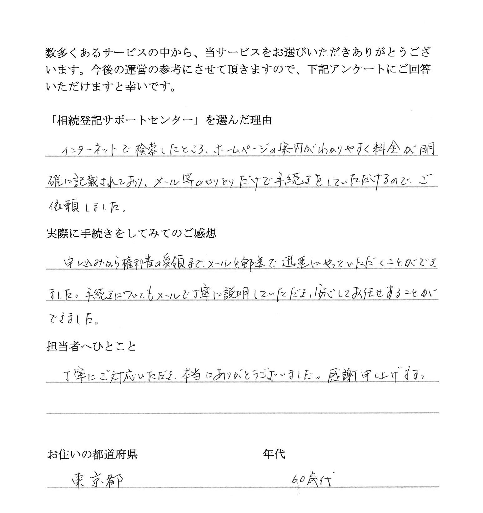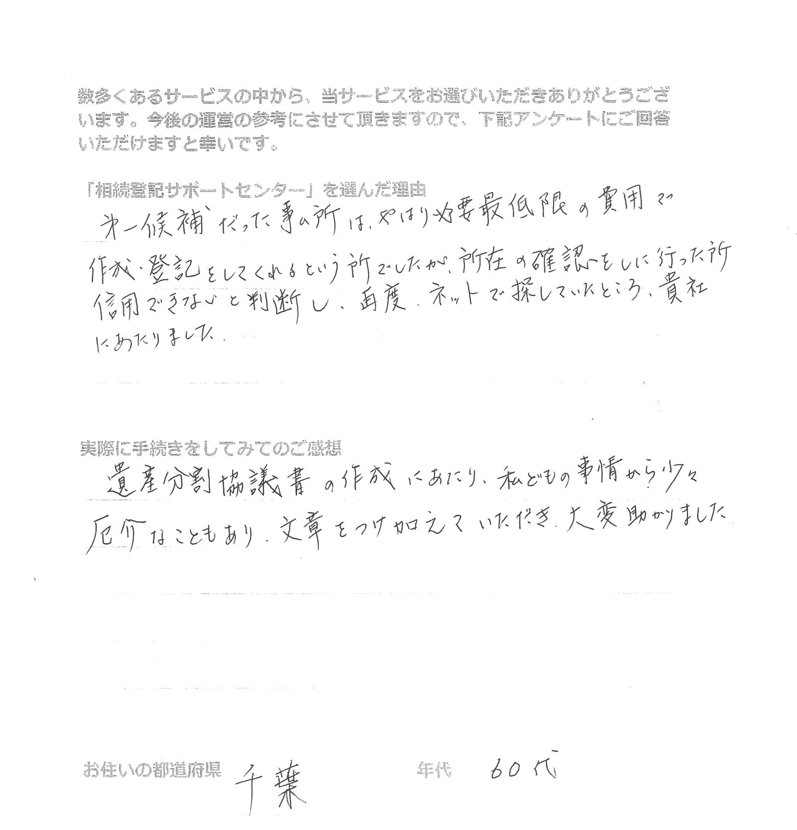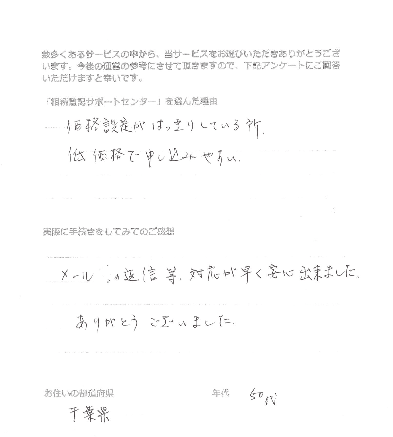 「相続登記サポートセンター」を選んだ理由 インターネットで検索したところ、ホームページの案内が分かりやすく料金が明確に記載されており、メール等のやりとりだけで手続きをしていただけるので、ご依頼しました。 実際に手続きをし …