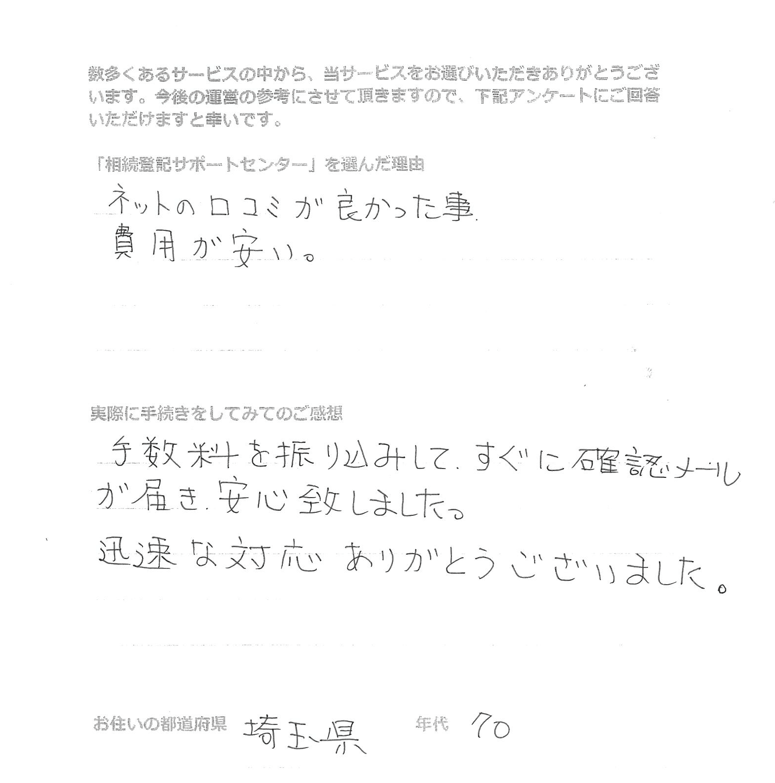 「相続登記サポートセンター」を選んだ理由 ネットの口コミが良かったこと。費用が安い。 実際に手続きをしてみてのご感想 手数料を振込みしてすぐに確認メールが届き安心しました。迅速なご対応ありがとうございました。