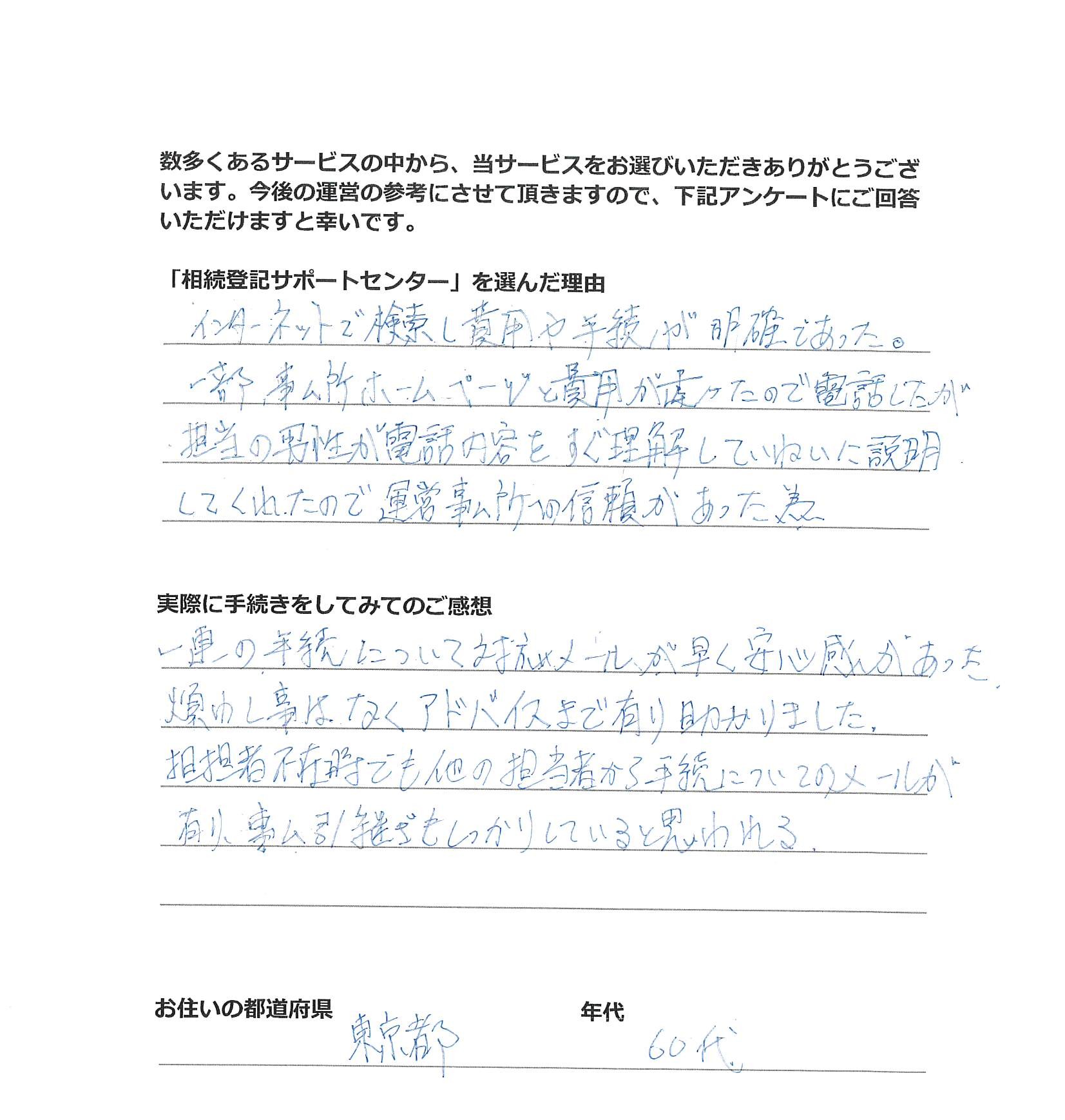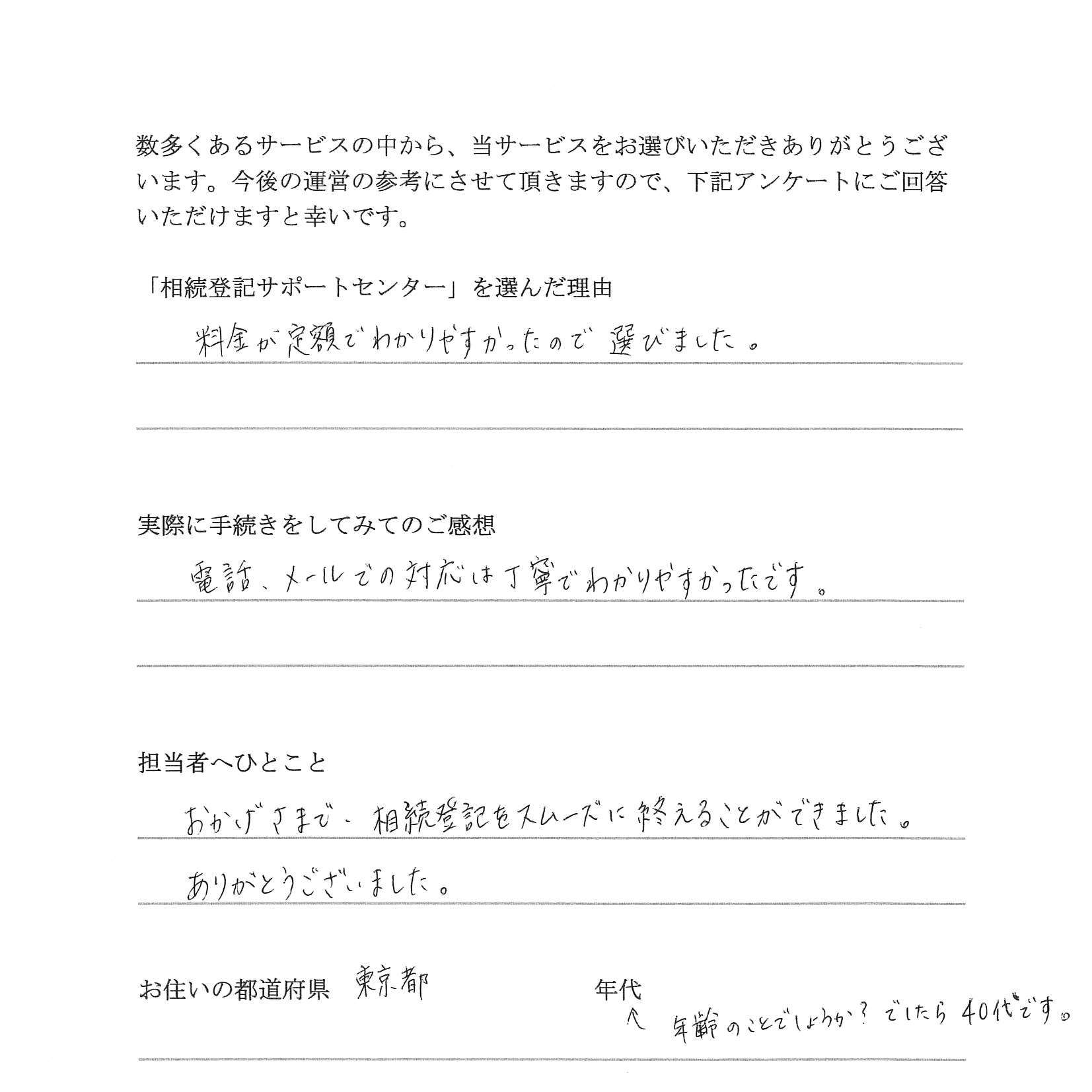 「相続登記サポートセンター」を選んだ理由 Webで相続登記を検索して調べているときに御社のセンターを発見し、平日は勤務のため最寄りの司法書士の先生を探したり、日中に依頼のための手続をとっている時間が限られているので、ネッ …