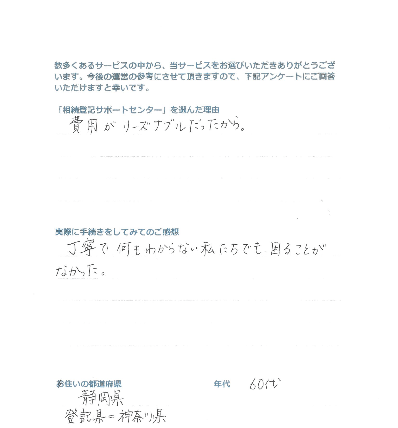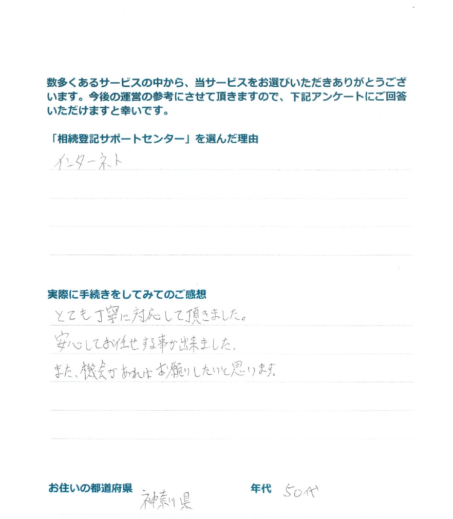 「相続登記サポートセンター」を選んだ理由 費用がリーズナブルだったから。 実際に手続きをしてみてのご感想 丁寧で何も分からない私たちでも、困ることがなかった。
