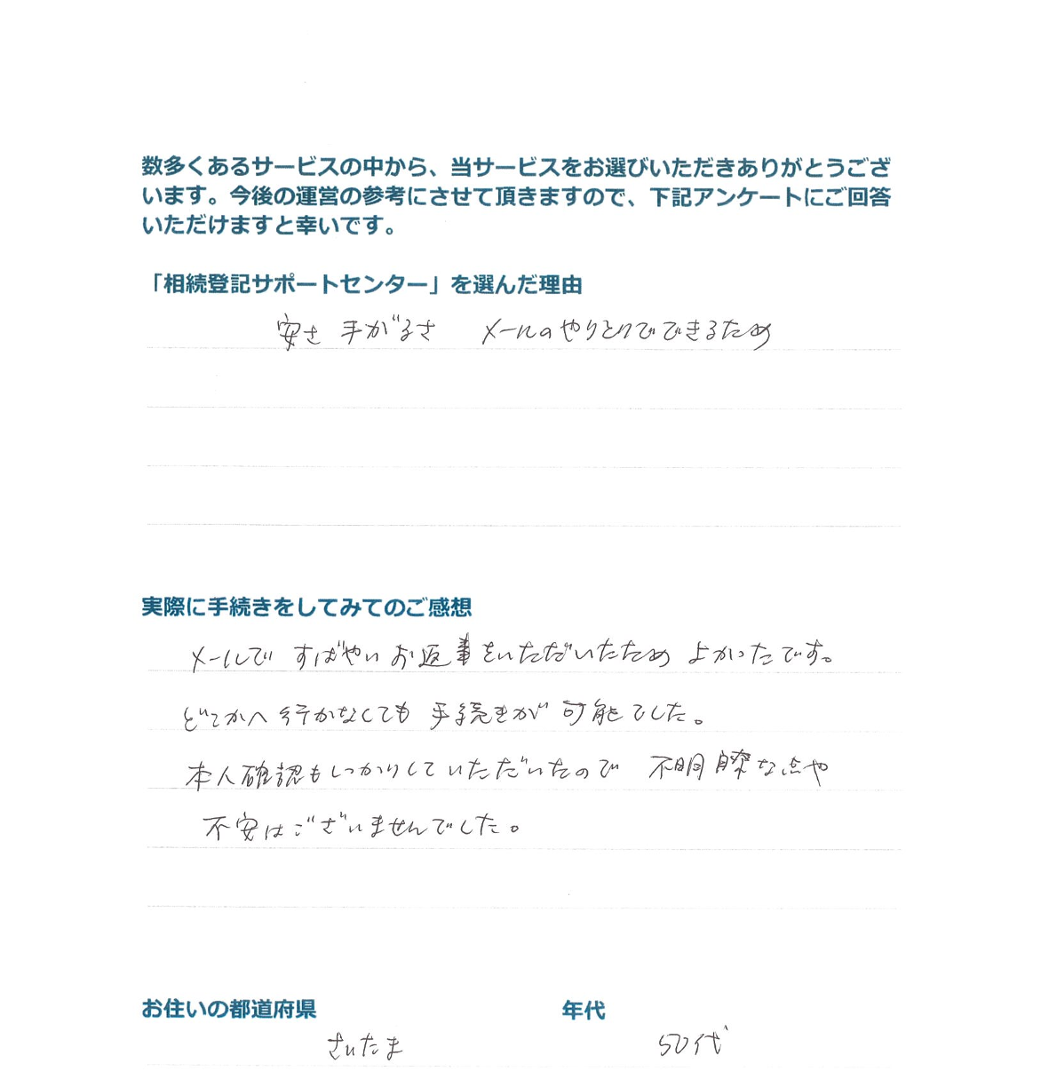 「相続登記サポートセンター」を選んだ理由 安さ 手軽さ メールのやりとりでできるため 実際に手続きをしてみてのご感想 メールですばやいお返事をいただいたためよかったです。どこかへ行かなくても手続きが可能でした。本人確認も …