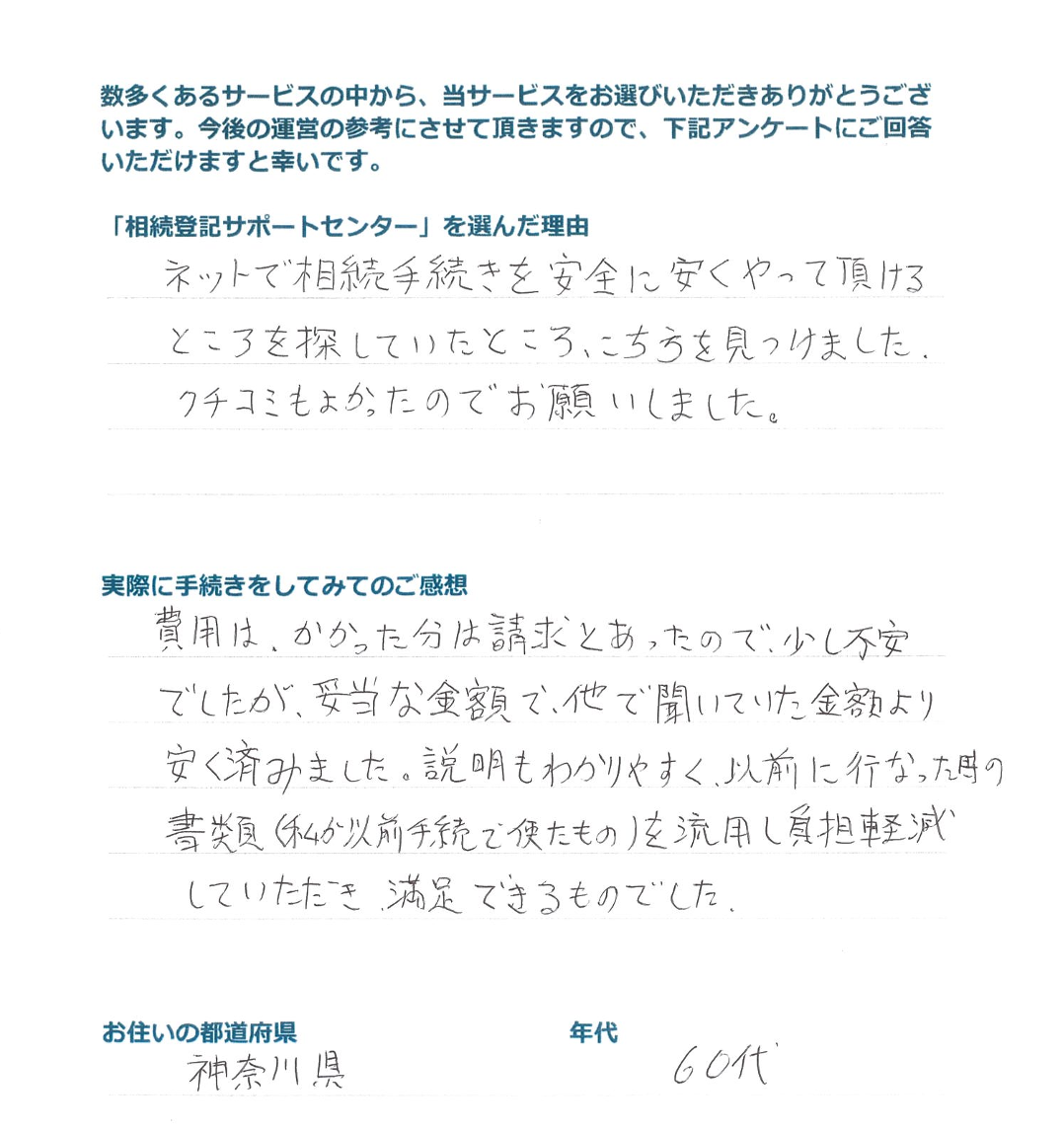 「相続登記サポートセンター」を選んだ理由 ネットで相続手続きを安全に安くやっていただけるところを探していたところ、こちらを見つけました。口コミもよかったのでお願いしました。 実際に手続きをしてみてのご感想 費用は、かかっ …