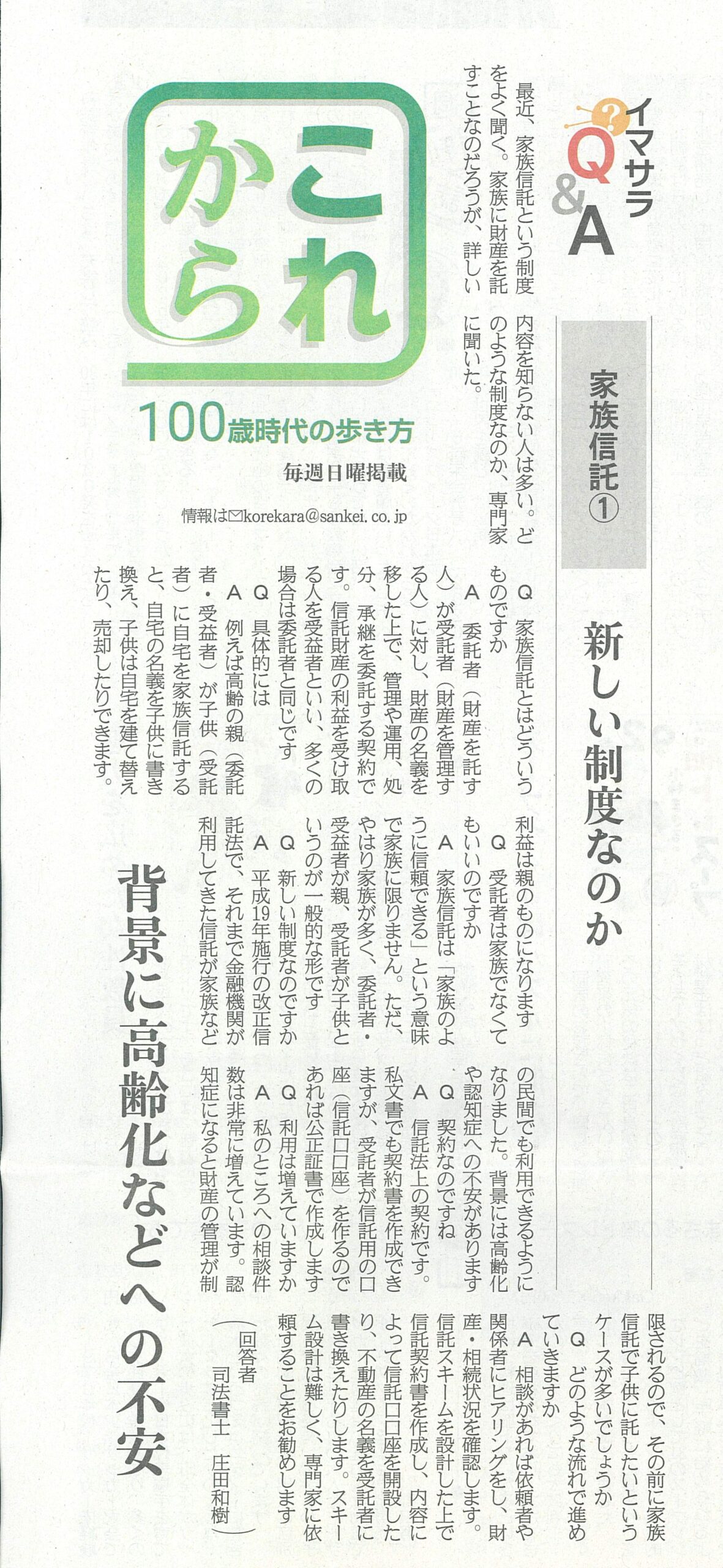 弊所代表の庄田が、産経新聞様の家族信託についてのインタビュー記事に協力いたしました。 2026年1月4日から毎週日曜日、全4回掲載しましたので、是非ご一読ください。 第1回目、1月4日掲載の記事はこちらです …