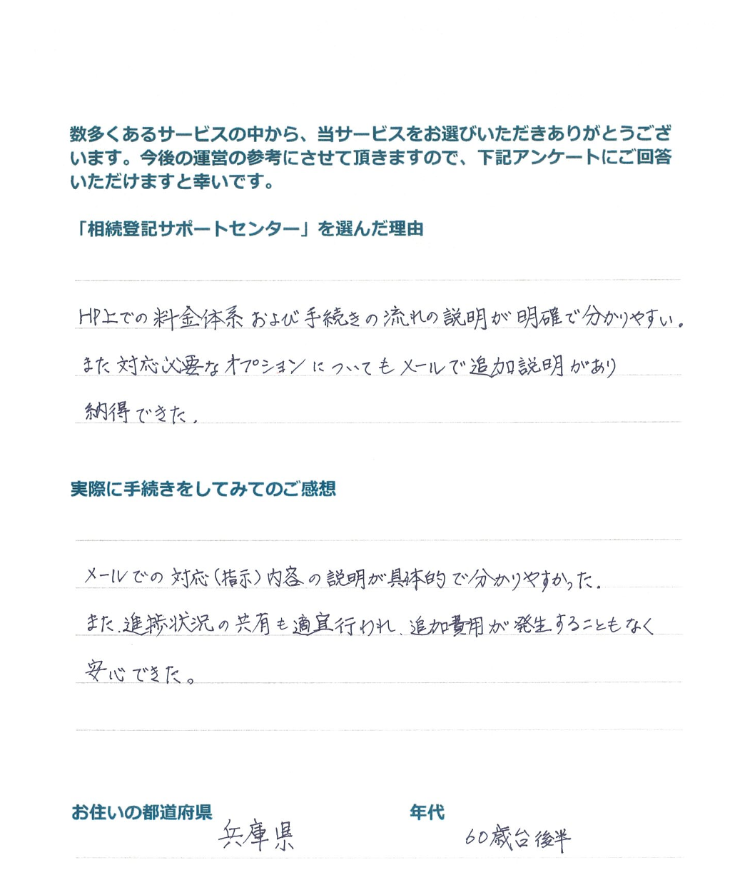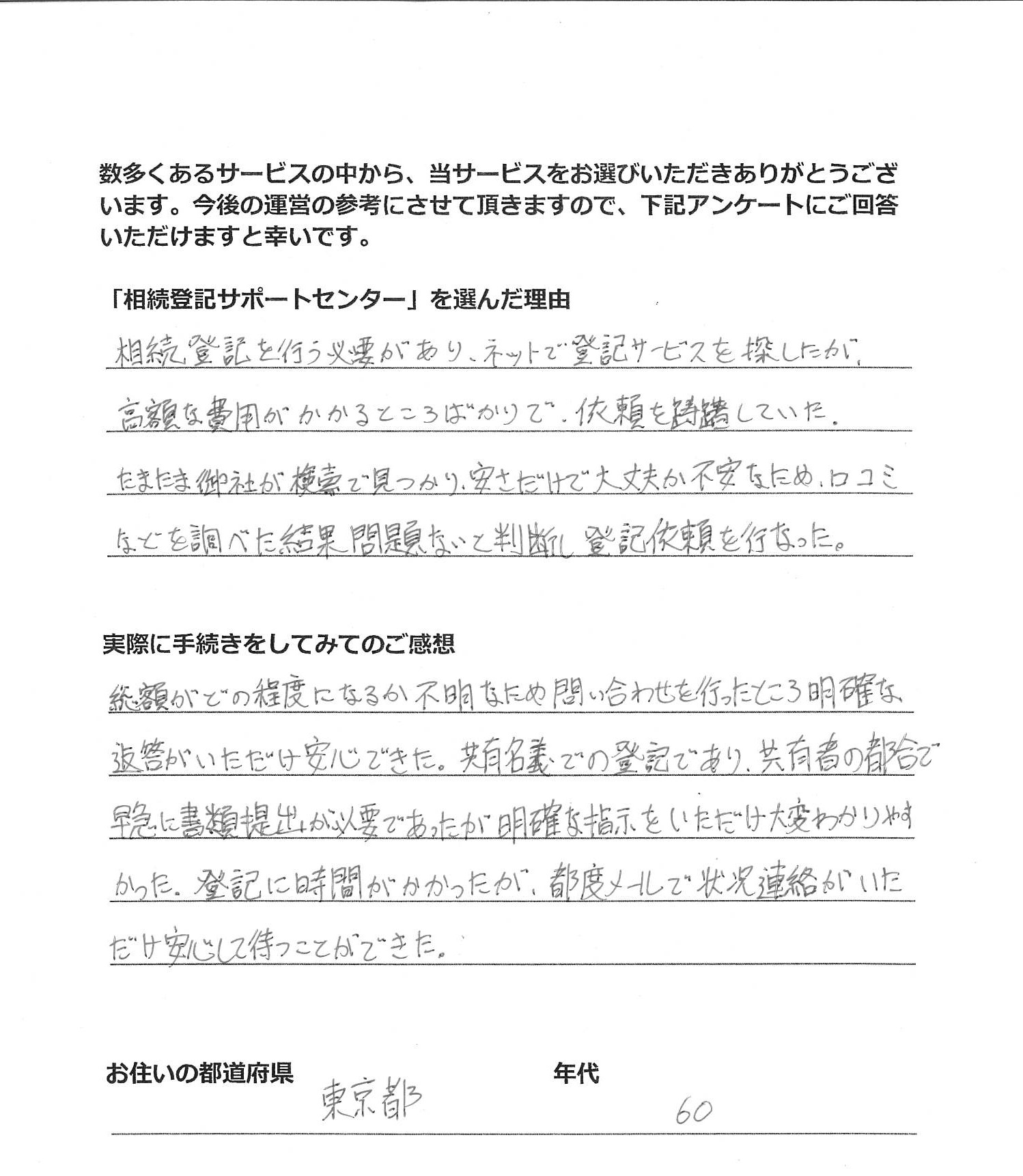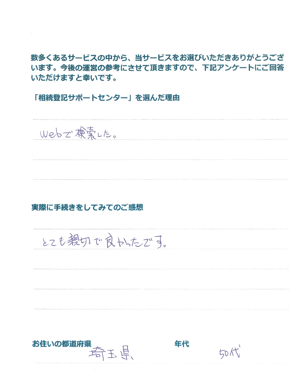 「相続登記サポートセンター」を選んだ理由 Webで検索した。 実際に手続きをしてみてのご感想 とても親切で良かったです。