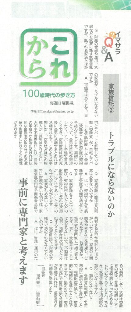 弊所代表の庄田が、産経新聞様の家族信託についてのインタビュー記事に協力いたしました。