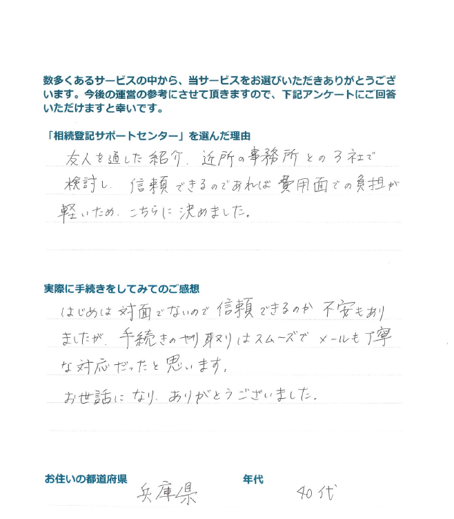 はじめは対面でないので信頼できるのか不安もありましたが、手続きのやり取りはスムーズでメールも丁寧な対応だったと思います。